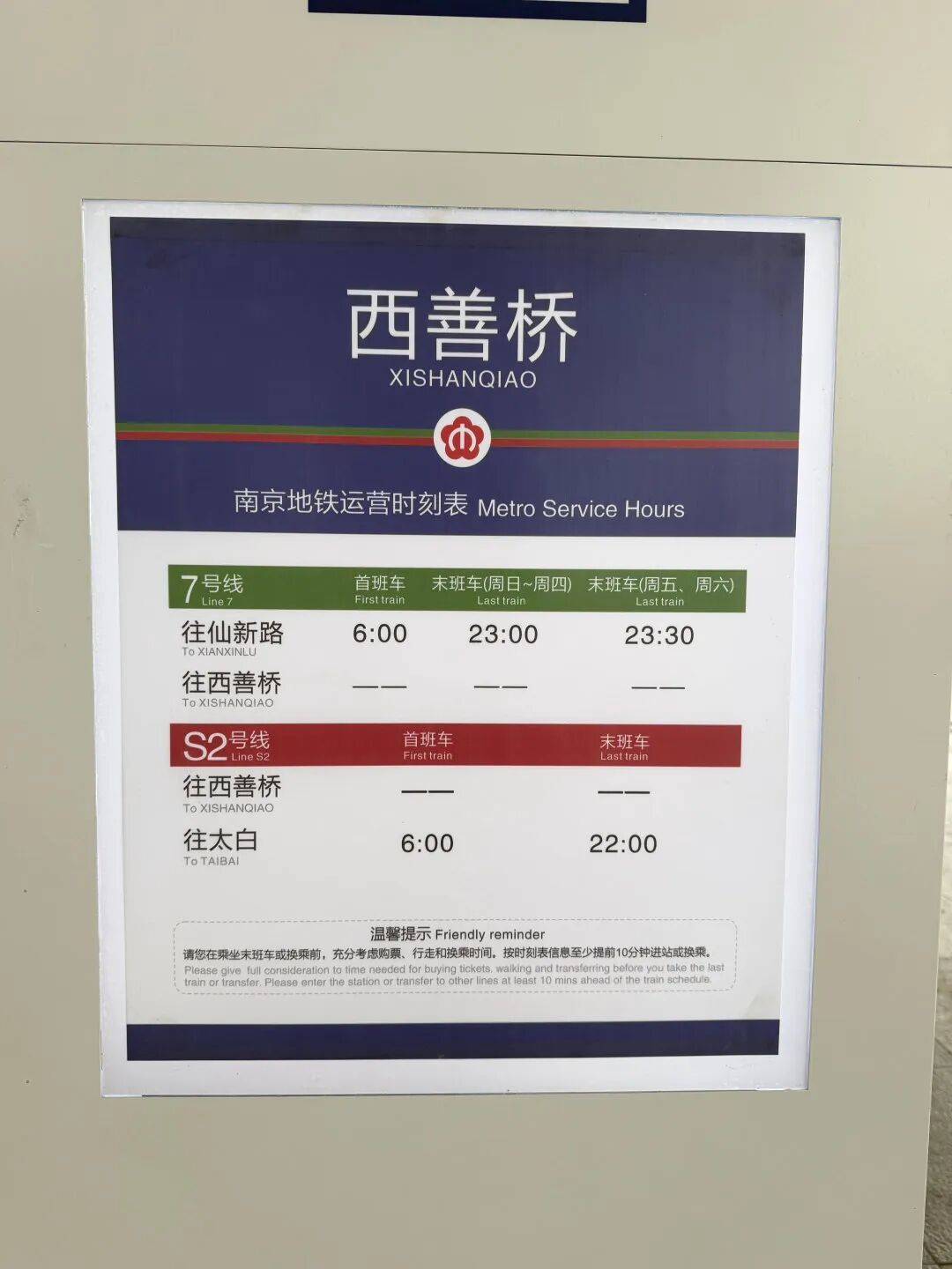 宁马市域(郊)线的运行时间,与南京地铁主体相同,首班车(6:00)和末班车(22:00)均两端对发。